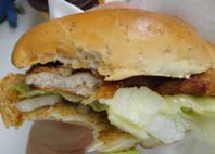 内容物としましては、ジューシーなチキンをパリパリの薄い衣を覆ったものをレタス、スライスオニオンと一緒に挟み、レモン風味のソースをかけたもの。