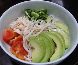 この時、自宅にあるのは乾麺のうどん、そして腐りかけたトマト(3個中2個はダメだったよ。母よ、一応冷蔵庫は時々チェックしてくだされ)と近所の人に貰った熟れすぎのキュウリ、そしてアボカド…缶詰置き場を漁って出てきたささみフレーク缶。