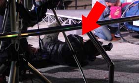 ↑地べたに仰向けになっている人。