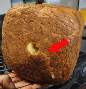 ちなみにパンの下部にはパン羽根が入っていた穴とそれを引き抜く際に出来た亀裂が入ります。