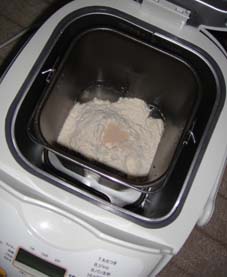 水、粉物、そしてドライイーストを入れて本体にセットします。