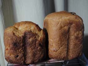 写真の右のパンも左のパンも全く同じ材料、同じ分量(1.5斤分)で焼いたもの。