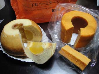 右側に写っているバームクーヘンが基本の形で、オレンジの他にもチョコレートやコーヒー、かぼちゃなど何種類かありました。