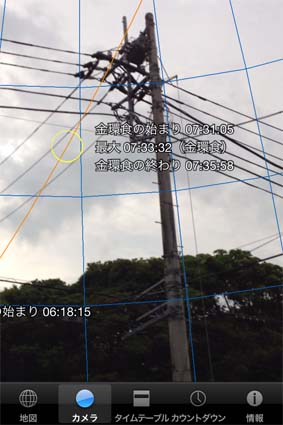 このアプリで自宅から、食の始まりは山の影になるものの、金環日食になるときは遮るものはないことを確認。