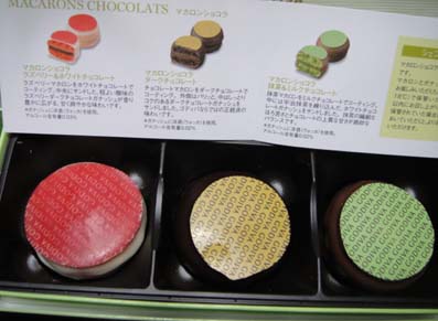 どれも、マカロンの間にそれぞれの味のチョコレートをサンドイッチ、その周りをまたチョコレートでコーティングしてあります。(ラズベリーはラズベリーダークチョコレートを挟みホワイトチョコレートでコーティング…という感じ)