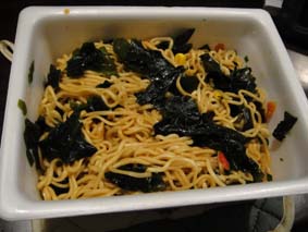 写真は醤油味のソースを入れてかき混ぜた後なので、わかめがまばらですが、湯切りをして蓋を開けた瞬間、容器一面わかめでした。