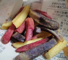 トヨシロ、キタムラサキ、ノーザンルビーと3種類の彩の綺麗なじゃがいもで作られたじゃがビーのようなお菓子。