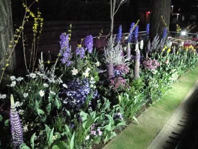 会社帰りに日本大通りを通って見ると、先日記事にした「第33回全国都市緑化よこはまフェア」の一環として花壇がライトアップされていました。