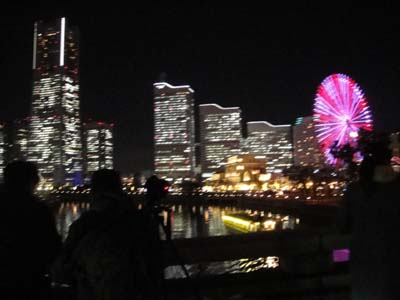 パシフィコ横浜の近くに掛かる国際橋から海の方を見ると大きなクリスマスツリーを模ったイルミネーションが出現。