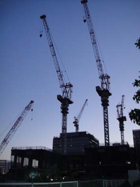 今日はいつものちょっと違う道を通って帰ったところ、タワークレーンが乱立しているところに遭遇。