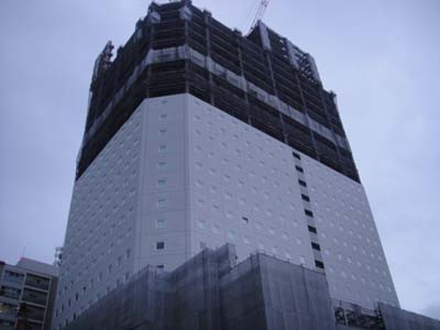 さて、少し前に『今日の一枚』を撮る橋のすぐ横で現在建設途中のアパホテルについて書きましたが、今日ふと見上げてみると外装材がついていました。