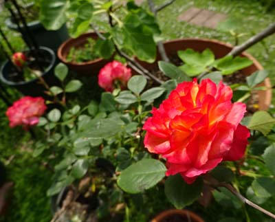 が、去年の台風前に鉢が飛ばないように動かした上、台風の強風で花の名前の札が紛失したため、既にどれがどのバラかもうひとつわからなくなっております。