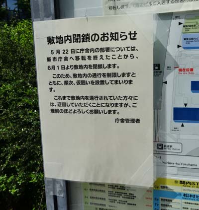 それに伴い、市役所の機能が4月から6月に掛けて移転していくらしいという話は聞いていましたが、この本庁舎に入る部署の人の引っ越しが終わり、本庁舎の移転は完了したらしく、敷地を閉鎖することになったようです。