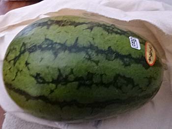 この西瓜、それなりの大きさだったため持っていたら西瓜の負荷で涼しかったのに汗をかきました。