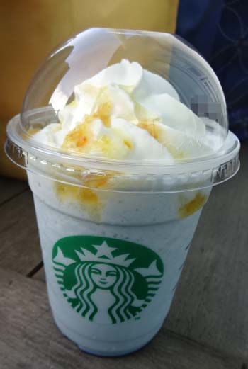 基本の味はバニラフラペチーノ。バタフライピーティーシロップとオレンジマーマレードのようなものが入っています。