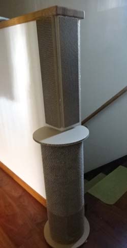 階段上の手摺壁の角で執拗に爪とぎするのでニトリでコーナーを守る爪とぎなるものを購入して置いてみました。