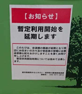橋自体は完成しているように見えるのですが、Kアリーナ側のペデストリアンデッキには貼紙が。