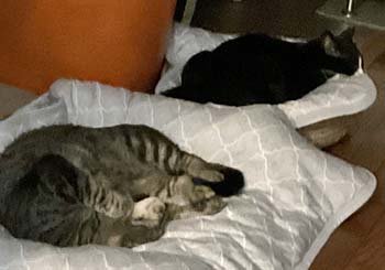 そんな中、猫たちエアコンの効いている部屋のちょっと荷物の陰になる場所に寝床を作ってあげたところ…。