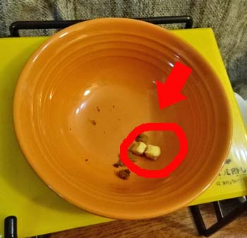 食べている様子を見ていると、ドライフードと一緒にトッピングも一度口に入れるのですが、ドライフードだけ食べてこの鶏肉のフリーズドライはプッと吐き出しています。