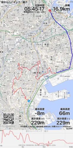 トラッカーを切るのを忘れていて、電車で移動(根岸駅から桜木町)の部分は青に色を変えてあります。