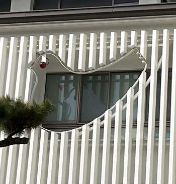 お菓子とは全然関係ないのですが、豊島屋本店の店舗正面の壁面は白の縦格子が一部鳩の形にくり抜かれているのですが、ここが非常用進入口(消防隊進入用)になっており、赤色灯が鳩の目になっているのです!