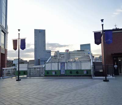 ↑Kアリーナ側から「(仮称)高島水際線デッキ」を見る。(仮囲中)