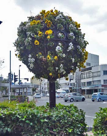 ↑ハンギングバスケットの下から水が滴る形の水のオブジェ。