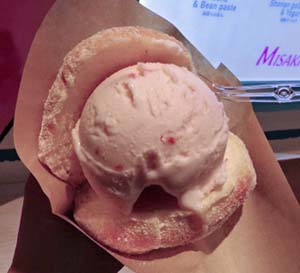 ミサキドーナツ。生地は「正しいドーナツ」という感じですが、中にジャムなどが入っていて美味しいのです。今日はプレーンのドーナツにアイス(数種類から選べる。あたしはストロベリーマスカルポーネを選択)が挟まったアイスサンドを食べました。