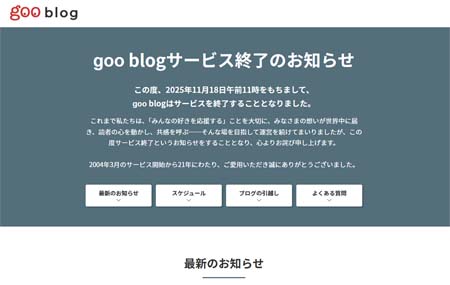 そういえばふと気付いたのですが、過去ログ置き場として使っていたgooブログがいよいよ明日終わります。