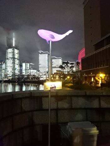 ↑横浜からみなとみらい、桜木町、関内、山下町・中華街と広範囲で行われているイルミネーションイベント「ヨルノヨ」の案内。このクジラちゃん(多分鯨だと思う…)はいろんな色に光ります。なんかかわいい。