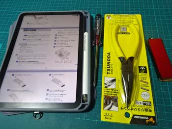 ↑パソコンさんの取扱説明書、No.0ドライバ、先曲がりラジオペンチ、そしてヒートシンク付きM.2 SSD