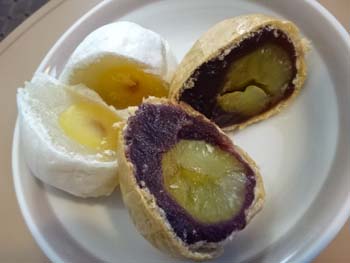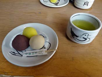 ちなみに手前の黒と白はお米の粉で作ったお餅を小豆餡と白餡で包んだもの。奥の黄色ものは味噌餡を白玉粉で包んだものだそう。