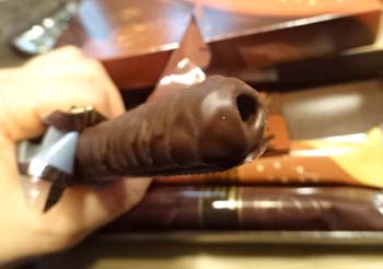 カカオ風味のシガールをビターチョコレートで包んだもの。